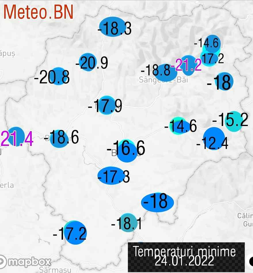 “Temperaturile au fost cuprinse între -21.4°C la Ciceu – Mihăieşti şi -12.4°C la Colibița. Sub -20°C am avut şi în Rodna ( -21.2°C ), Bichigiu ( -20.9 ), Tîrlişua ( -20.8 ). Pe unde a fost “mai cald” a fost doar din cauza nebulozității sau a vântului care nu a stat cuminte, cam pe nicăieri, “foehn-ul” slab făcându-şi apariția, local. La noapte, însă, odată cu stabilizarea maselor de aer, în condițiile în care presiunea atmosferică relativă va tinde spre 1035 Mb iar cerul va fi senin lacrimă, temperaturile vor plonja sub minimele de astăzi, cu valori posibile de -25°C”, a anunțat în această dimineață Meteo BN.