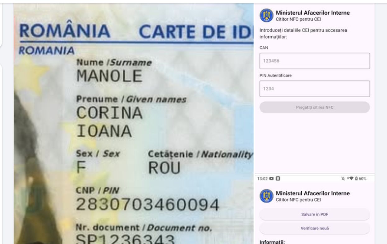 Ministerul Afacerilor Interne, a realizat o aplicație Android care permite citirea rapidă și sigură a datelor din Cartea Electronică de Identitate (CEI) prin tehnologia NFC. Tot ce trebuie să faci este să activezi NFC pe telefonul tău, să apropii CEI de dispozitiv, să aștepți citirea datelor, apoi să îndepărtezi CEI de telefon și informațiile vor fi afișate imediat pe ecran.