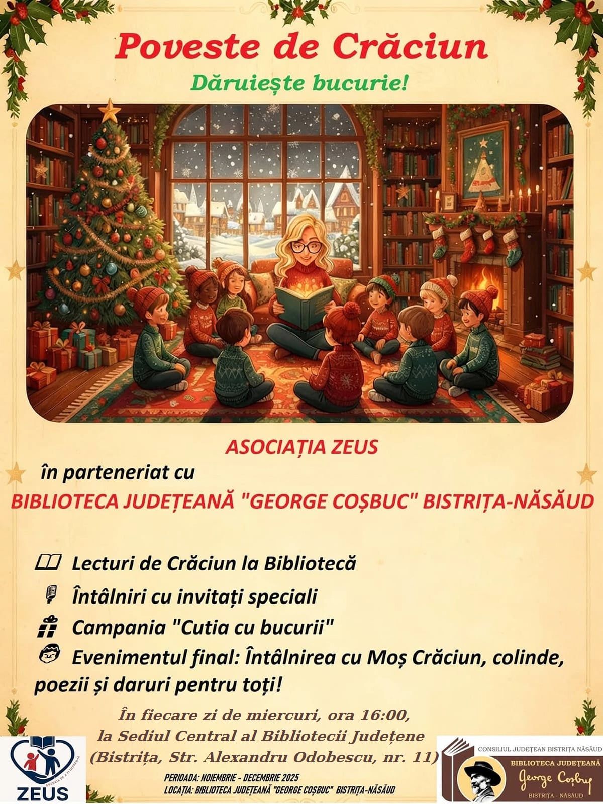 Asociația Zeus, în parteneriat cu Biblioteca Județeană „George Coșbuc” Bistrița-Năsăud, organizează, în perioada noiembrie – decembrie 2025, seria de activități culturale : „Poveste de Crăciun. Dăruiește bucurie !”