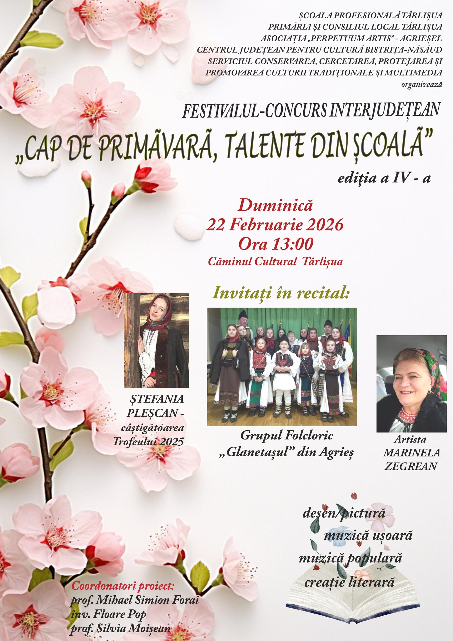 ”CAP DE PRIMĂVARĂ, TALENTE DIN ȘCOALĂ”- Ediția a IV-a, pe 22 Februarie, la Târlișua