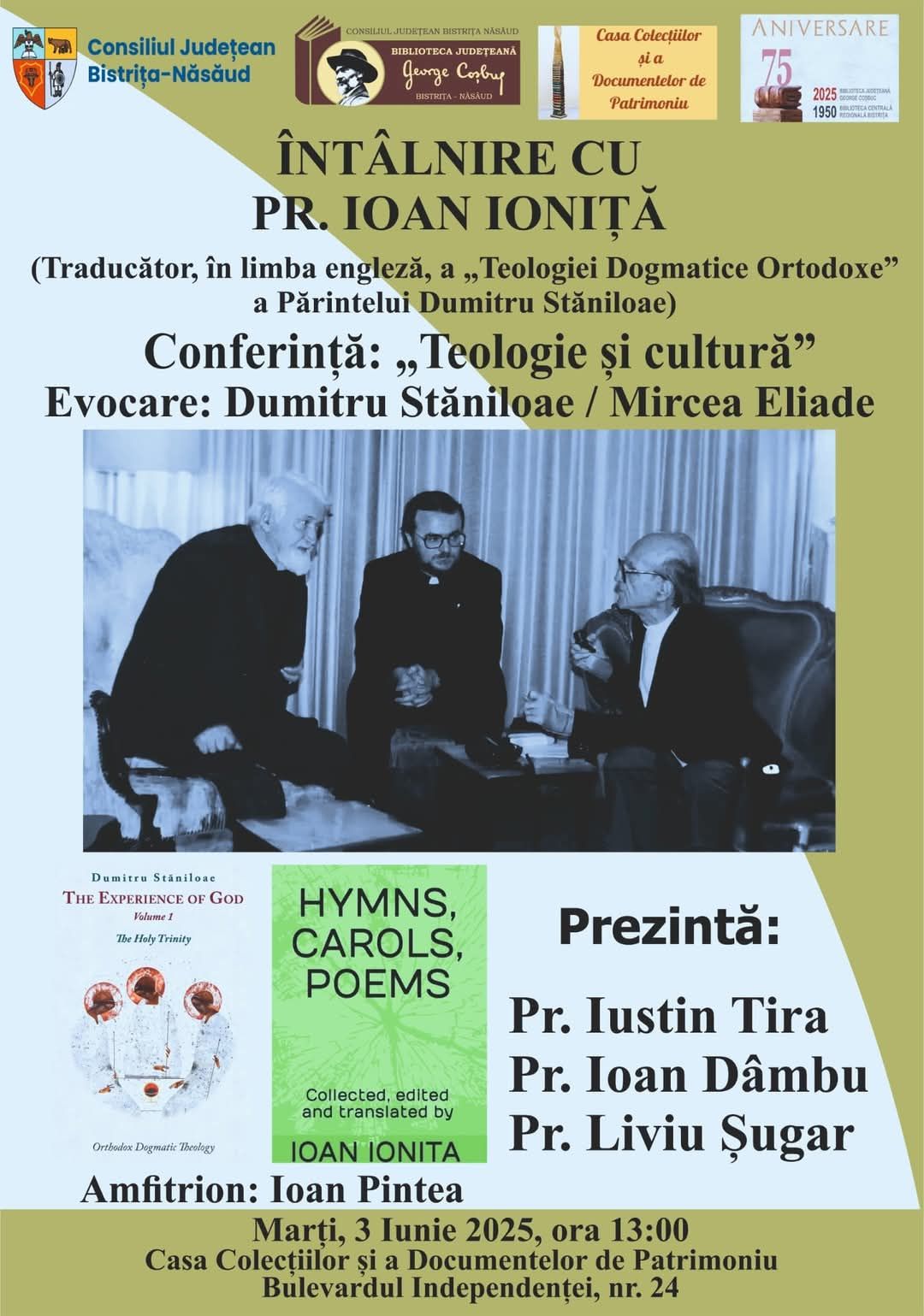 Consiliul Județean Bistrița-Năsăud, Biblioteca Județeană „George Coșbuc” Bistrița-Năsăud și Casa Colecțiilor și a Documentelor de Patrimoniu Bistrița organizează marți, 3 Iunie 2025, ora 13:00, Evenimentul Cultural: „Întâlnire cu Pr. Ioan Ioniță” (Traducător, în limba engleză, a „Teologiei Dogmatice Ortodoxe” a Părintelui Dumitru Stăniloae