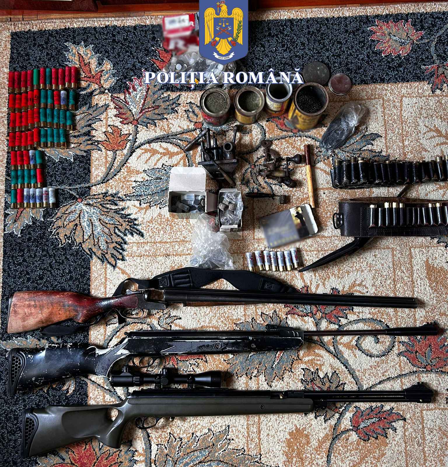 Tot ieri, 14 martie, polițiștii au indisponibilizat de la domiciliul bărbatului o armă letală cu destinația vânătoare și 2 arme neletale cu destinația tir sportiv, toate deținute legal, însă cu privire la care există suspiciunea că ar fi fost folosite la săvârșirea unor infracțiuni. Totodată, au mai fost ridicate în vederea continuării cercetărilor, cantitatea de 712 grame pulbere neagră, utilizată la producerea de muniție artizanală, 2 prese pentru confecționarea de muniție artizanală, 19 cartușe confecționate artizanal și 79 de cartușe deținute legal.