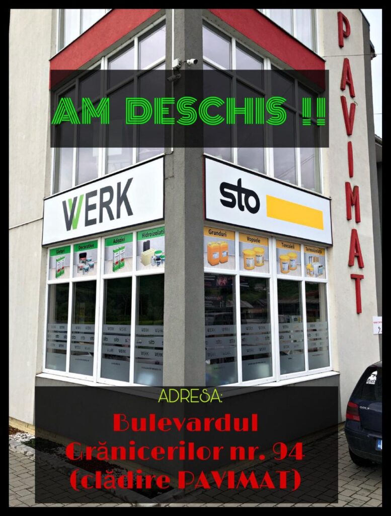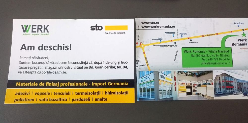 Un magazin nou s-a deschis în orașul Năsăud ! Este vorba de un showroom marca Werk-Sto, în care găsiți toată gama de produse profesionale de finisaj în construcții, termoizolații, vopsele, tencuieli decorative, adezivi, hidroizolații, polistiren, vată bazaltică, pardoseli, unelte, la cel mai bun raport preț-calitate.