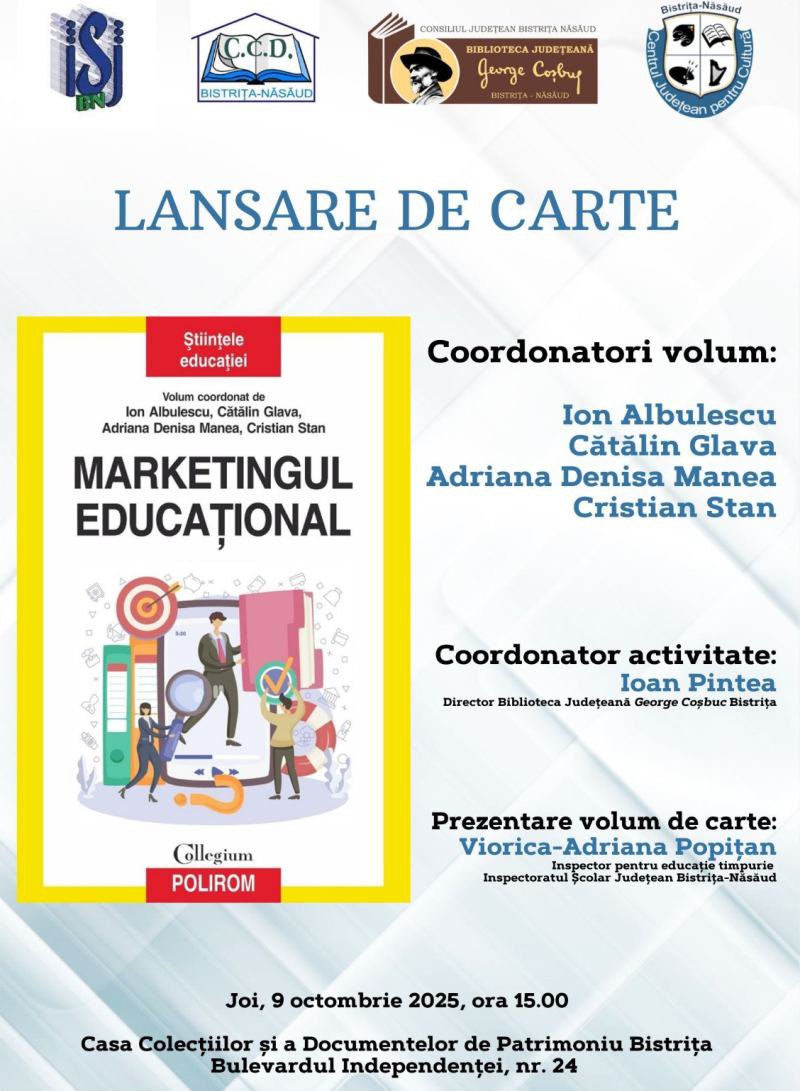 Joi, 9 octombrie 2025, ora 15.00, va avea loc lansarea cărții „Marketingul educațional”, coordonată de Ion Albulescu, Cătălin Glava, Adriana Denisa Manea și Cristian Stan, la Casa Colecțiilor și a Documentelor de Patrimoniu