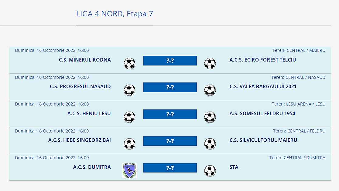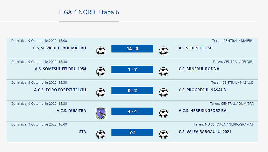 Ieri și astăzi, etapa cu numărul 6 a adus rezultate scontate în cele două serii din fotbalul din BN. În Nord, prima clasată – Silvicultorul Maieru – a făcut spectacol în fața propriilor suporteri după un 14-0 administrat celor de la Heniu Leșu, în timp ce urmăritoarele Năsăud și Rodna s-au impus și ele conform așteptărilor.