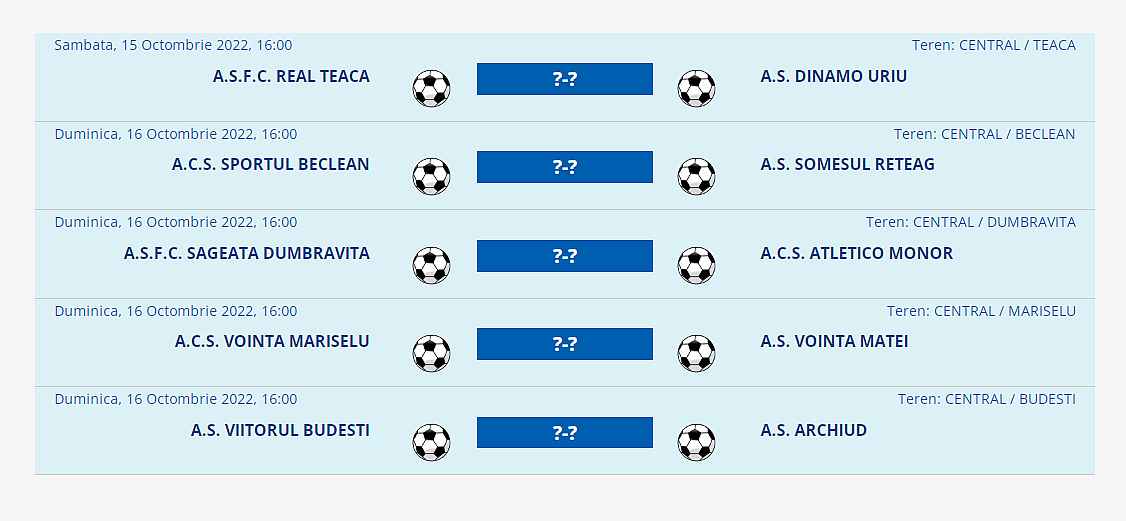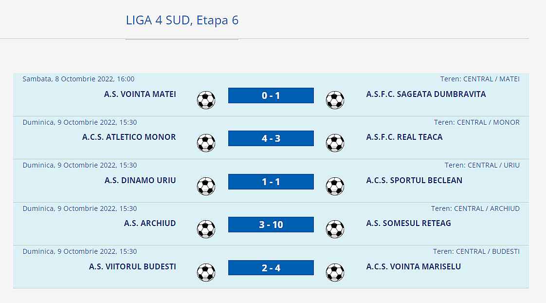 În Seria Sud, derby-ul rundei s-a jucat la Monor, acolo unde liderul s-a impus la limită, cu 4-3, contra lui Real Teaca. Într-un alt meci interesant, cu implicații pe podium, Dinamo Uriu și Sportul Beclean au terminat la egalitate. Iată rezultatele complete: