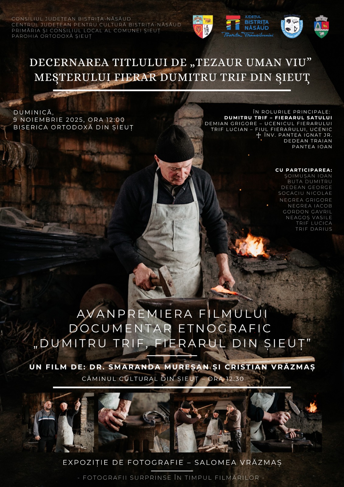 Pe 9 Noiembrie, decernarea Titlului de „Tezaur Uman Viu” meșterului fierar Dumitru Trif din Șieuț și avanpremiera filmului documentar etnografic „Dumitru Trif, fierarul din Șieuț”