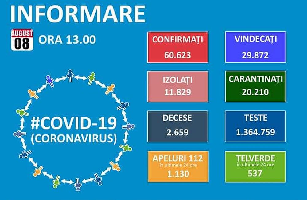 Grupul de Comunicare Strategică a raportat sâmbătă (8 august) 1.350 de noi infecții cu coronavirus (din 21.444 de teste efectuate) și 43 de decese, centralizate în ultimele 24 de ore, asta după ce ieri a fost înregistrat atât cel mai mare număr zilnic de cazuri (1.378) raportat de la izbucnirea pandemiei în România, cât și cel mai mare număr de decese (50) înregistrate în 24 de ore.