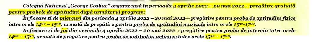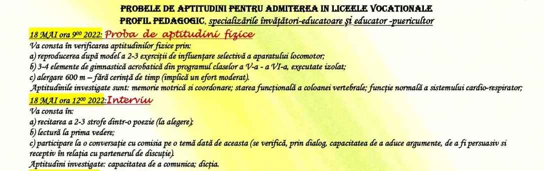 Pentru acest profil, Pedagogic, înscrierea se face la secretariatul colegiului în perioada 16 – 17 mai iar desfășurarea probelor de aptitudini va avea loc între 18-20 mai 2022 după următorul program: